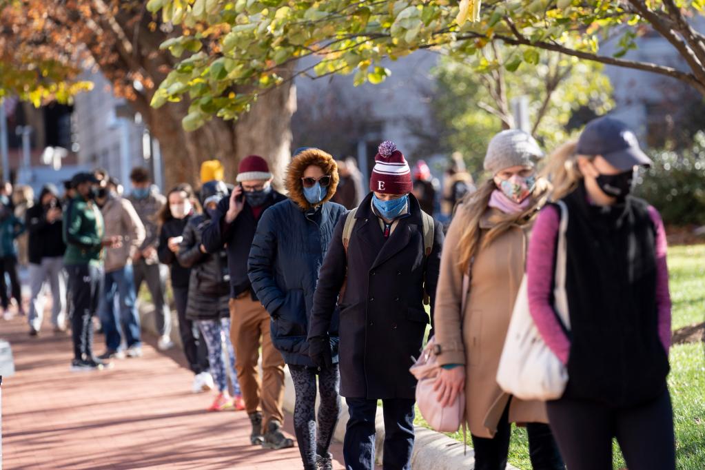 2020年11月23日,人们在美国华盛顿的一处新冠病毒检测点排队等候检测。(新华社记者刘杰摄)