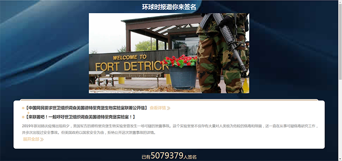 据《环球时报》实时更新的联署链接显示,截至7月21日晚,已有超过500万中国网民联署了这封呼吁世卫组织调查德特里克堡生物实验室的公开信。