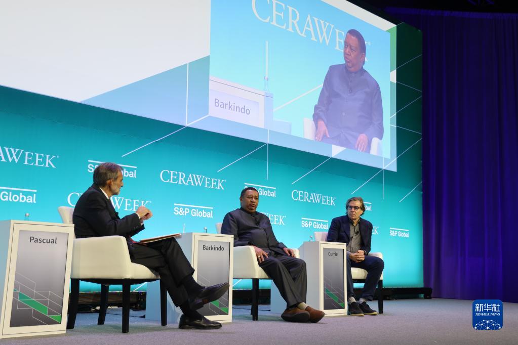3月8日,石油输出国组织(欧佩克)秘书长巴尔金多(中)在美国休斯敦出席剑桥能源周会议并发表讲话。新华社记者 徐剑梅 摄