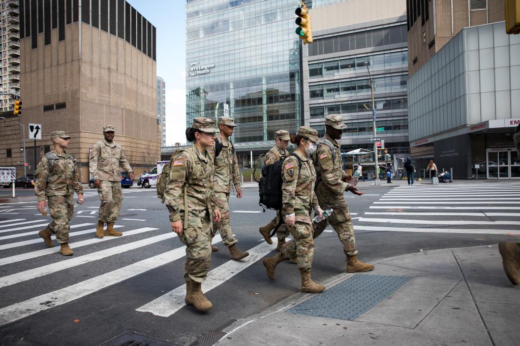 2020年4月8日,在美国纽约,美军士兵从一家医院外走过。新华社发 (郭克摄)