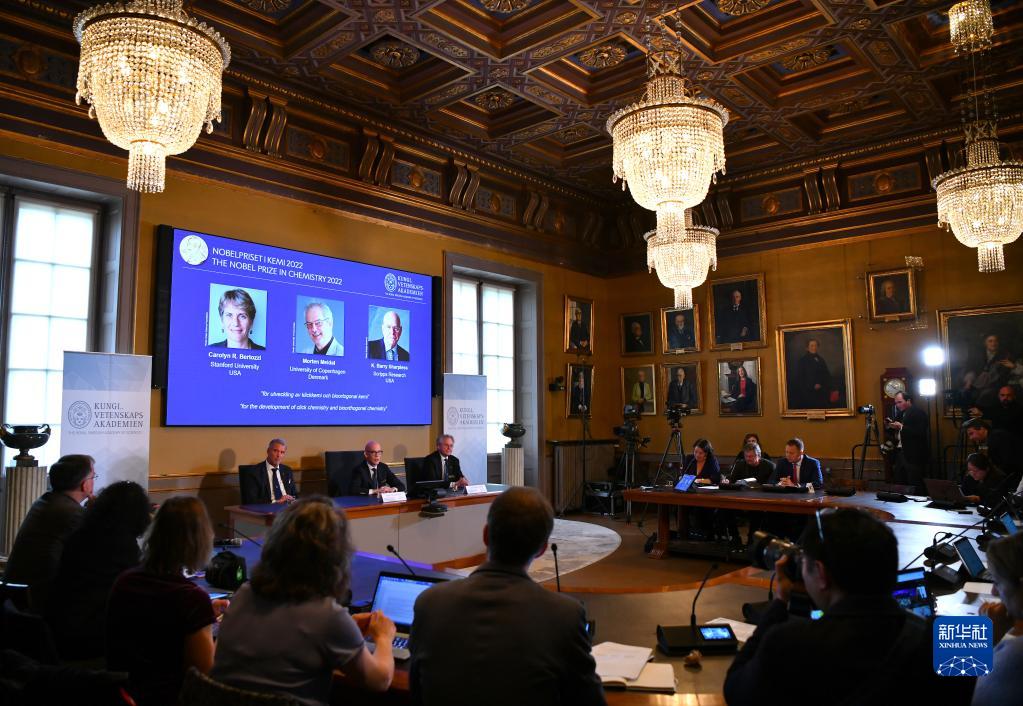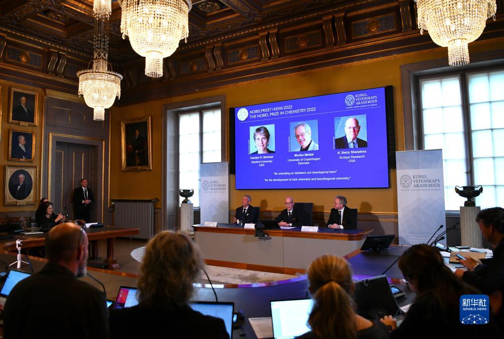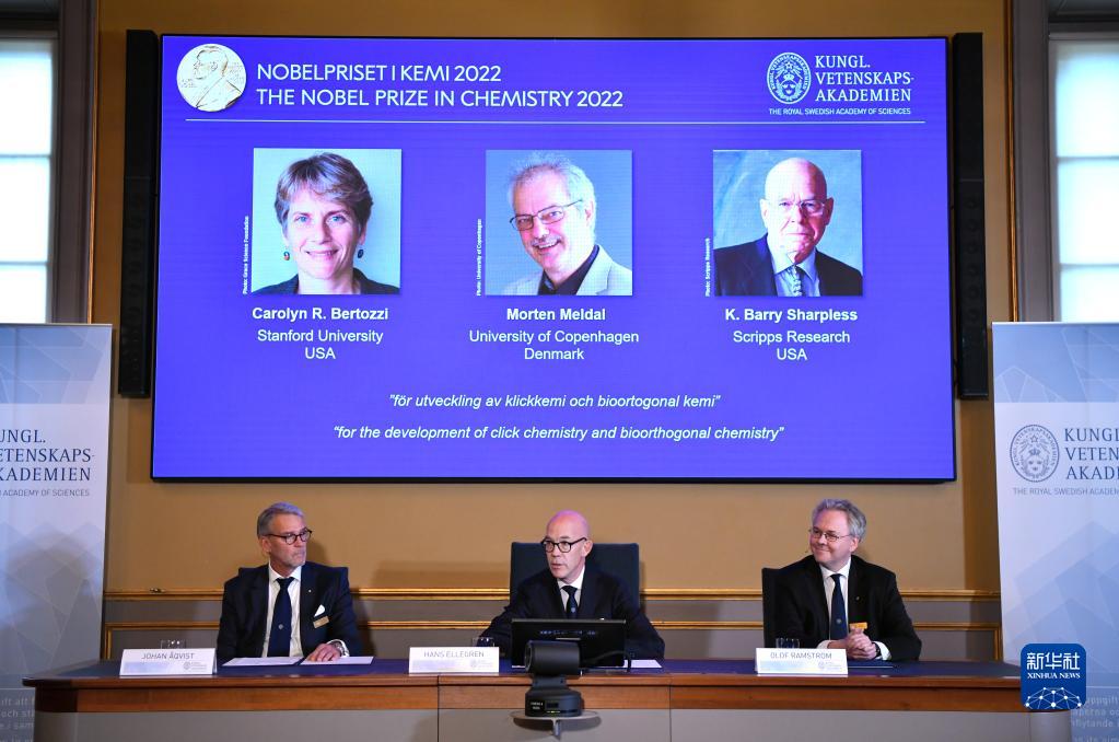 新华社斯德哥尔摩10月5日电(记者和苗 付一鸣)瑞典皇家科学院5日宣布,将2022年诺贝尔化学奖授予美国科学家卡罗琳·贝尔托齐、卡尔·巴里·沙普利斯和丹麦科学家莫滕·梅尔达尔,以表彰他们在发展点击化学和生物正交化学方面的贡献。