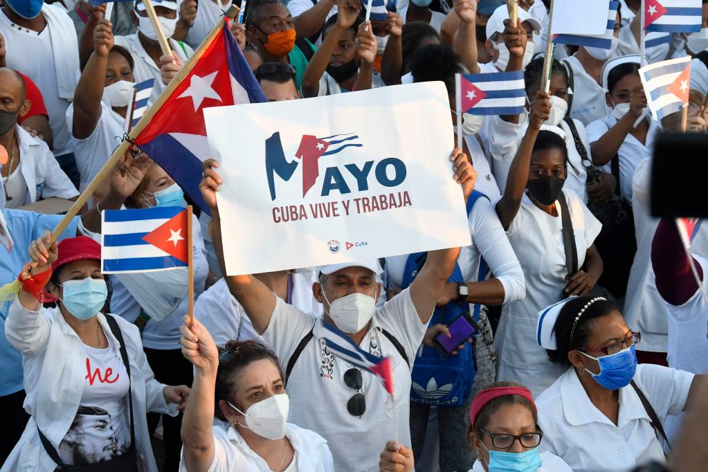 5月1日,古巴民众在哈瓦那参加“五一”国际劳动节集会游行。古巴多地5月1日举行“五一”国际劳动节集会游行,上百万民众走上街头,反对美国对古封锁,表达爱国情感,并向古巴医疗工作者和科研人员致敬。新华社发(华金·埃尔南德斯摄)