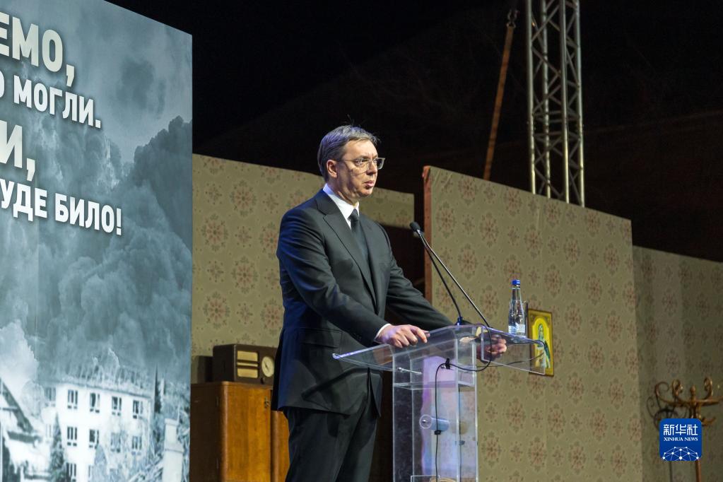 3月24日,在塞尔维亚北部城市松博尔,塞尔维亚总统武契奇在悼念北约轰炸南联盟遇难者仪式上致辞。新华社记者石中玉摄
