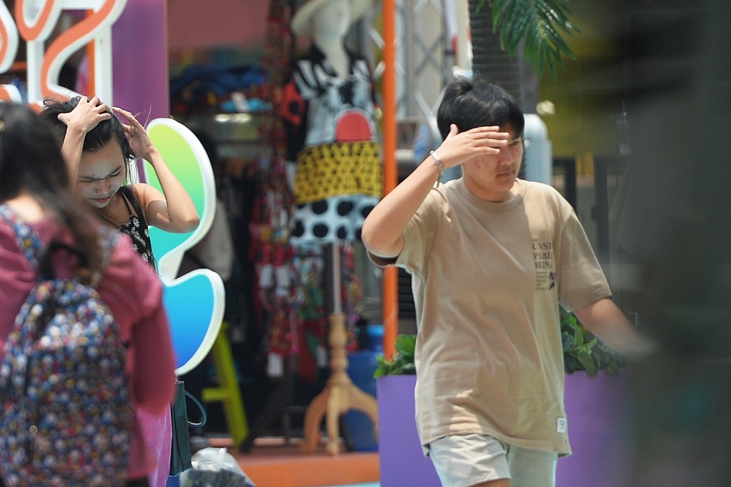 4月19日,行人在泰国曼谷街头用手遮阳。新华社发(拉亨摄)
