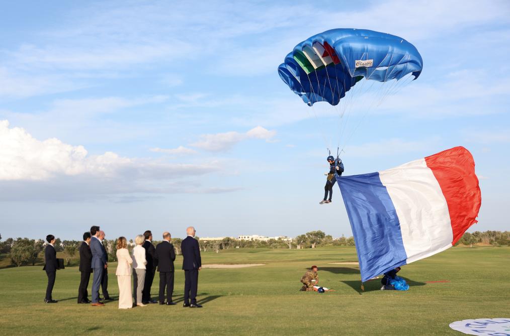 6月13日,在意大利南部普利亚大区法萨诺市,七国集团与会领导人观看高空跳伞表演。七国集团峰会13日在意大利南部普利亚大区法萨诺市开幕。新华社记者 李京 摄