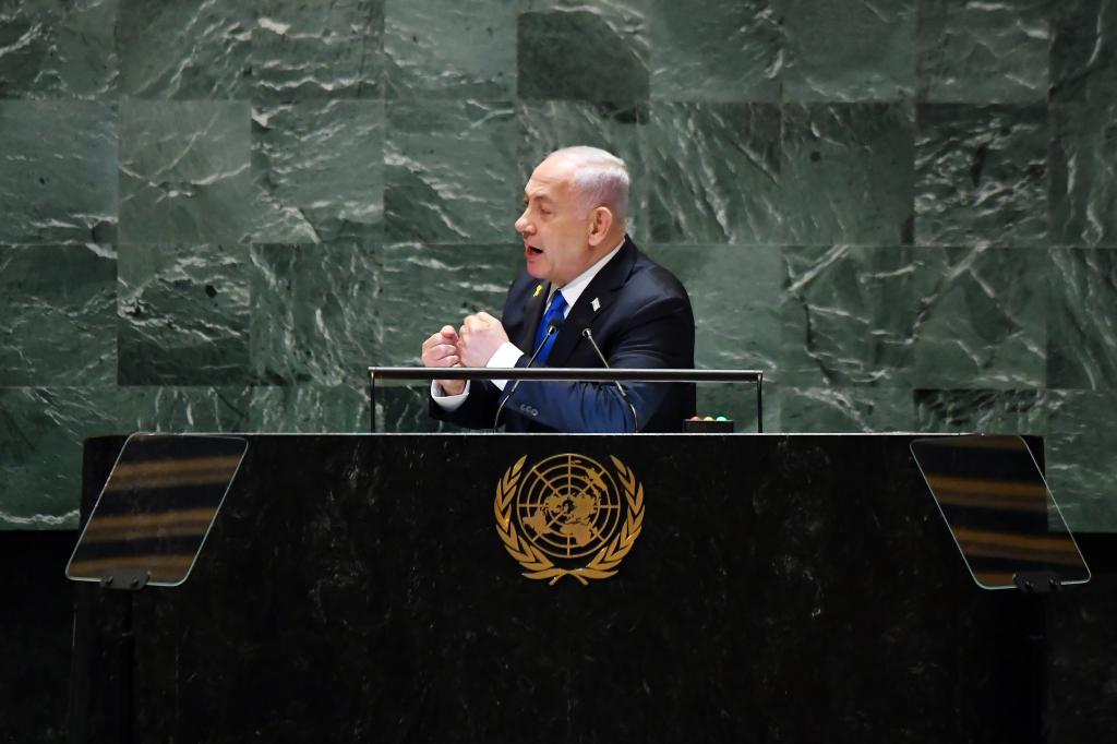 9月27日,在位于美国纽约的联合国总部,以色列总理内塔尼亚胡在第79届联大一般性辩论上发言。新华社记者李睿摄