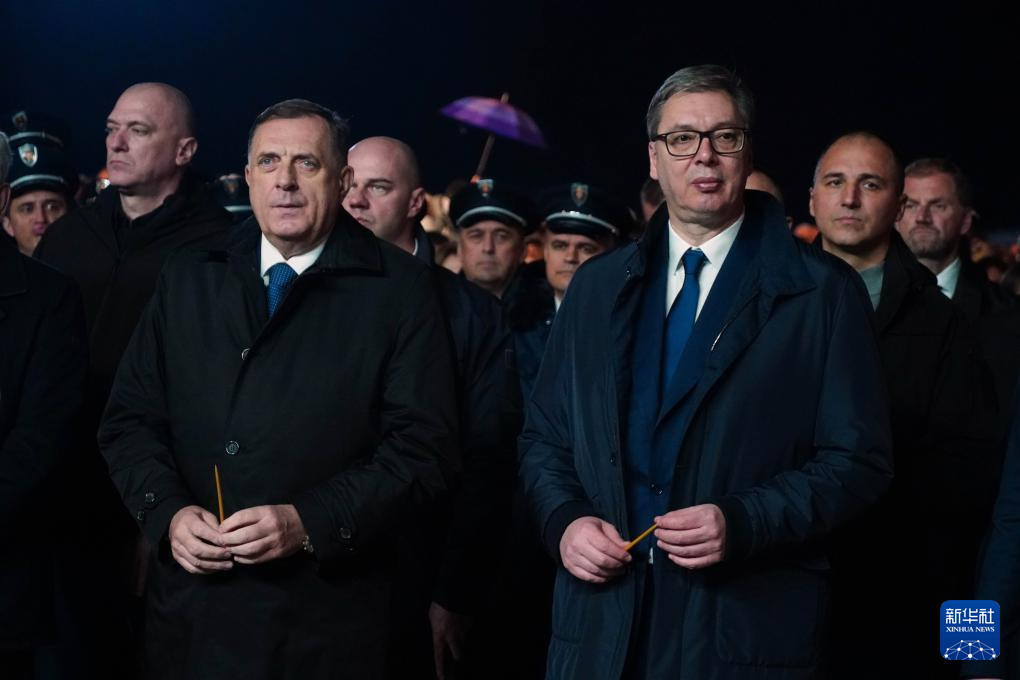 3月24日,在塞尔维亚首都贝尔格莱德,塞尔维亚总统武契奇(前右)和波黑主席团塞族成员多迪克(前左)出席纪念活动。新华社发(普雷德拉格·米洛萨夫列维奇摄)