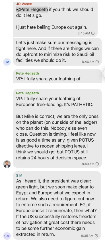 日期为本月14日的群聊记录显示,与万斯同名的用户似乎对空袭胡塞武装的必要性抱有顾虑:“我认为我们正在犯一个错误。3%的美国贸易(运输)通过苏伊士(运河),而40%的欧洲贸易通过那里。现实风险是,(美国)公众不理解这一点或者不明白为什么有必要……更大风险在于,油价会有中幅至大幅上涨。”