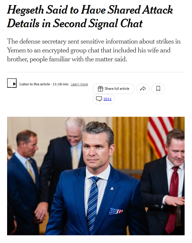 《纽约时报》认为,新近曝光的“信号门2.0”让外界再次审视赫格塞思的管理能力和判断力。