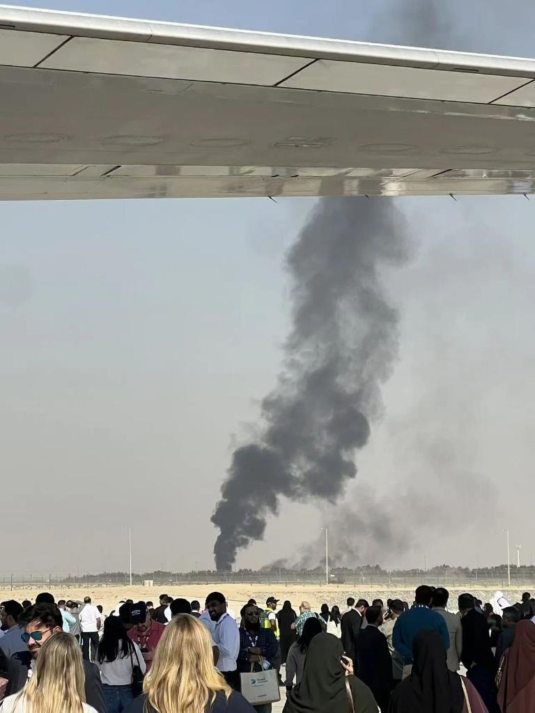 11月21日,在阿联酋迪拜,飞机坠毁现场冒出滚滚浓烟。新华社发