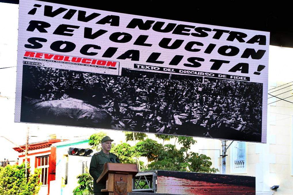 4月16日,在古巴首都哈瓦那,古共中央第一书记、古巴国家主席迪亚斯-卡内尔在纪念集会上发表讲话,纪念古巴革命领袖菲德尔·卡斯特罗宣布开始实行社会主义革命65周年。新华社发(华金·埃尔南德斯摄)