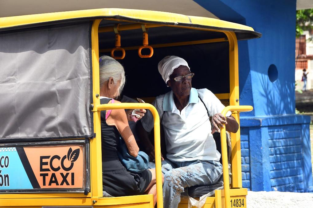 4月3日,在古巴首都哈瓦那,两名女子乘坐电动三轮车出行。新华社发(华金·埃尔南德斯摄)