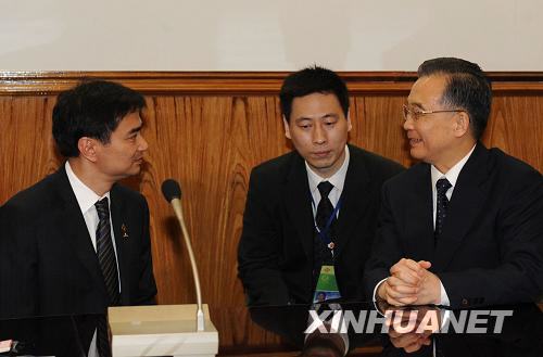 4月11日,泰国总理阿披实专程前往机场为中国国务院总理温家宝送行,双方举行了简短会晤。新华社记者黄敬文摄
