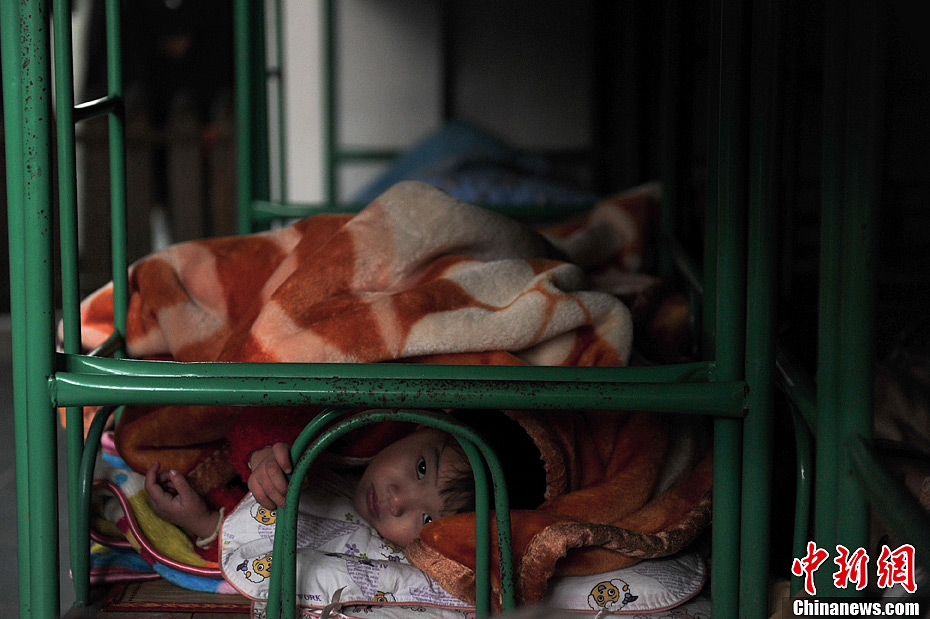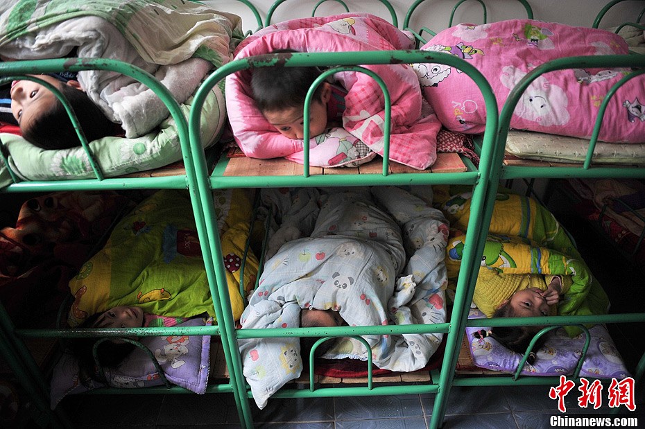 1月6日,广西南宁,一所农民工子弟幼儿园的孩子们正在准备午睡。近日,广西持续低温,一些校舍陈旧的农民工子弟学校里,学生们的学习和生活条件亟待改善。据了解,近年广西南宁部分专门接收外来务工人员子女入学的民办学校,因资金紧缺而无法改善学校硬件设施,有的学校面临租金大幅上涨陷入困境甚至停办。中新社发 洪坚鹏 摄