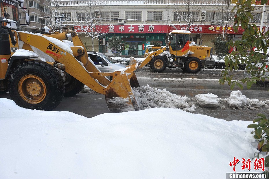 2月19日,安徽淮河以南迎来大雪到暴雪,最大降雪量达22厘米。局部地区还出现了晚间“雷打冬”现象,积雪和道路结冰给当地交通造成了不利影响。图为大雪袭城,铲雪车上路清理积雪。中新社发 李超钰 摄