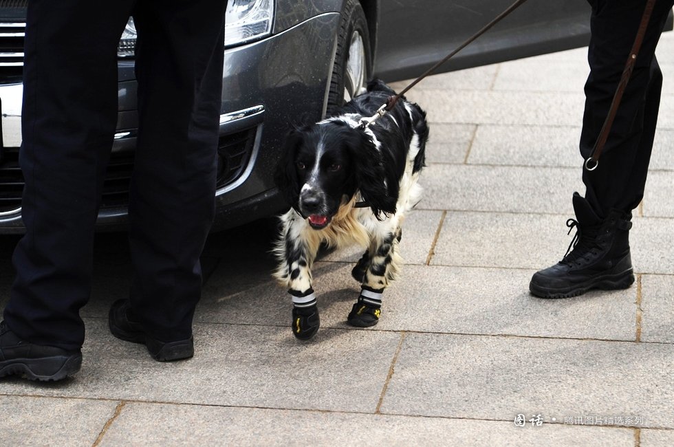 【11、警犬出动保治安】2013年3月2日,北京,穿着特制“新鞋“的警犬跟随安保人员对进入广场的车辆进行仔细检查。摄/林梦/东方IC