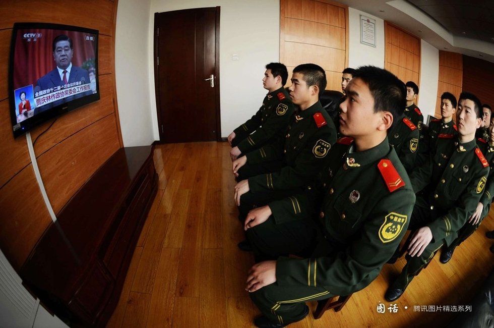 【15、大家一起看两会】2013年3月3日,武警黄岛边检站官兵在收看全国政协十二届一次会议开幕式电视直播。摄/俞方平 |