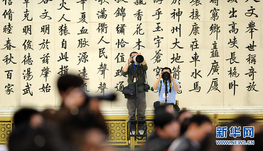 十二届全国人大一次会议、全国政协十二届一次会议分别于2013年3月5日、3月3日在北京人民大会堂开幕。采访报道两会的各路摄影摄像记者,使出浑身解数、十八般武艺抢拍精彩瞬间。对于媒体来说,两会现场就是一场没有硝烟的战争。图为两名摄影记者站在人民大会堂金色大厅“中华颂”书法作品前拍摄。新华网 陈竞超 摄