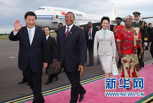 3月24日,国家主席习近平乘专机抵达达累斯萨拉姆尼雷尔国际机场,开始对坦桑尼亚进行国事访问。坦桑尼亚总统基奎特和夫人到机场迎接习近平和夫人彭丽媛。新华社记者 兰红光 摄