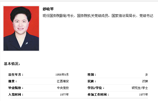 舒晓琴,女,汉族,1956年9月出生,江西靖安人。1977年4月入党,1977年7月参加工作,中央党校研究生学历,法学学士,副总警监。历任江西宜春团地委副书记(主持工作),万载县委常委、常务副县长,高安县委副书记、县长,宜春地委委员、宜春市(县)委书记,景德镇市委副书记、市长、市委书记。2001年12月任江西省委常委、政法委书记。2007年12月任江西省委常委、政法委书记,省公安厅党委书记。2008年1月任江西省委常委、政法委书记,省公安厅厅长、党委书记,武警江西省总队第一政委、第一书记。2013年4月任国务院副秘书长、国务院机关党组成员,国家信访局局长、党组书记。