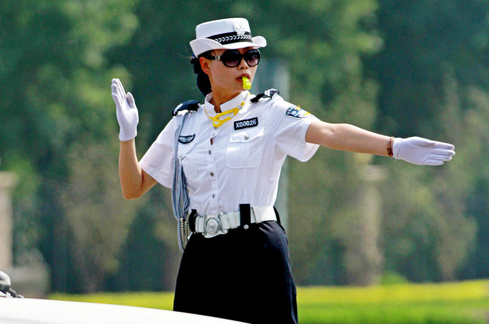 2013年6月16日,河南省安阳市街头,身着夏装的女警在街头执勤。清一色的白色帽子、手套、短袖衬衫、警靴,深蓝色的短裙,初换夏装的美女协警,不仅服装漂亮,指挥交通也非常专业。“看着前行、左转的手势非常专业,一点也不输男交警,而且给人的感觉更亲切点。”过路司机纷纷表示。“太帅了!简直跟空姐一样!”市民李女士赞道。