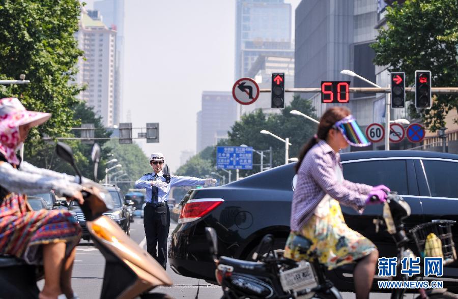 7月12日,24岁的女交警芮彩云在南京中山南路与淮海路交界的十字路口执勤。芮彩云于2011年开始从事交警工作,每天的工作时间为早上7:15至11:30和下午15:00至18:00。江苏省气象台7月8日、9日、10日连续三天发布高温黄色预警,江苏省大部分地区最高气温超过35℃;7月11日,江苏省高温黄色预警升级为高温橙色预警,南京、苏州、无锡等地区7月11至12日最高气温升至37℃以上。记者在对南京市内多个行业进行走访中看到,尽管连续5天出现高温,劳动者们仍在各自平凡的岗位上默默挥洒汗水。受台风“苏力”影响,江苏省气象台于7月13日上午9时40分解除高温橙色预警信号。“苏力”过后,江苏省将迎来新一轮的高温天气。新华社发(李响 摄)