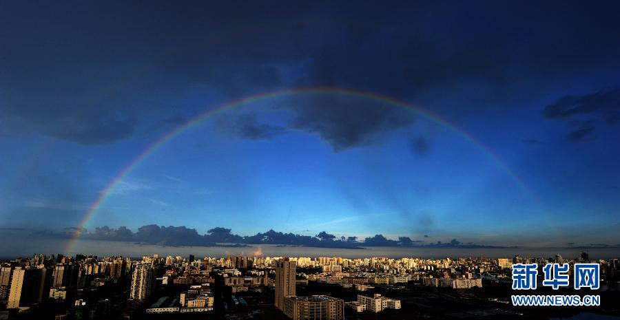 这是在海口市海甸岛拍摄的双彩虹(7月9日摄)。 7月9日,狂风暴雨后的海口,两道彩虹横跨海甸岛和海口主城区两岸,成为傍晚海口美丽的风景。 新华社记者 赵颖全 摄