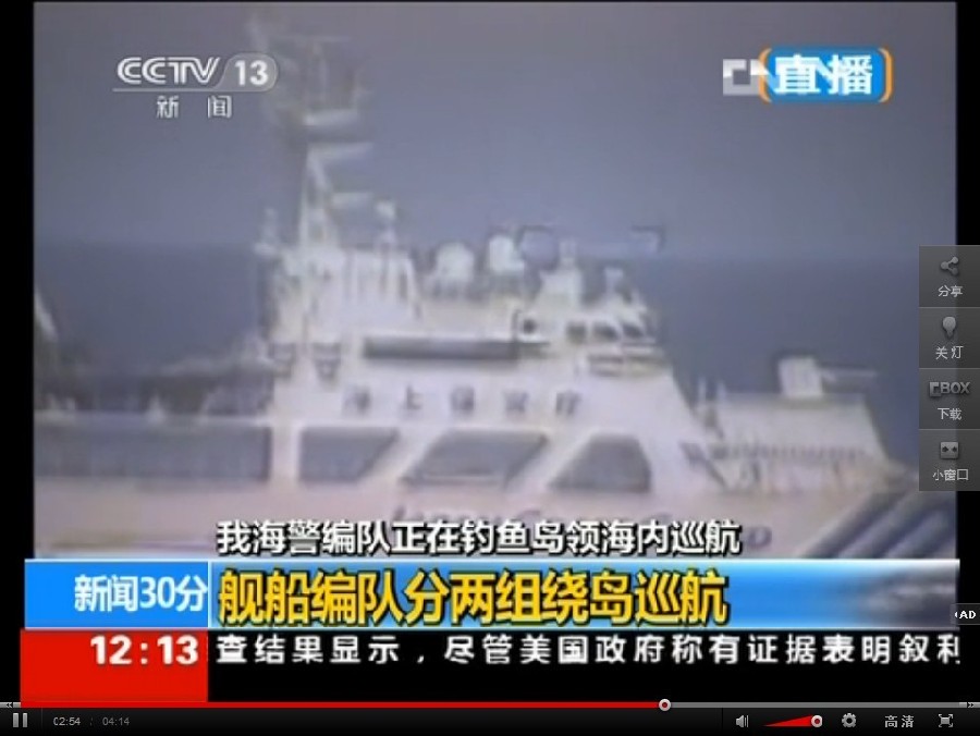 今天一早,我国7艘海警舰船编队在距离钓鱼岛4海里的位置进行绕岛巡航。目前,3艘海警船已驶到钓鱼岛的最北段,另外4艘船逆时针绕岛抵达钓鱼岛最南侧。7艘日本海上保安厅船只从今早开始一直在跟踪中国海警船。(央视记者丛威娜)