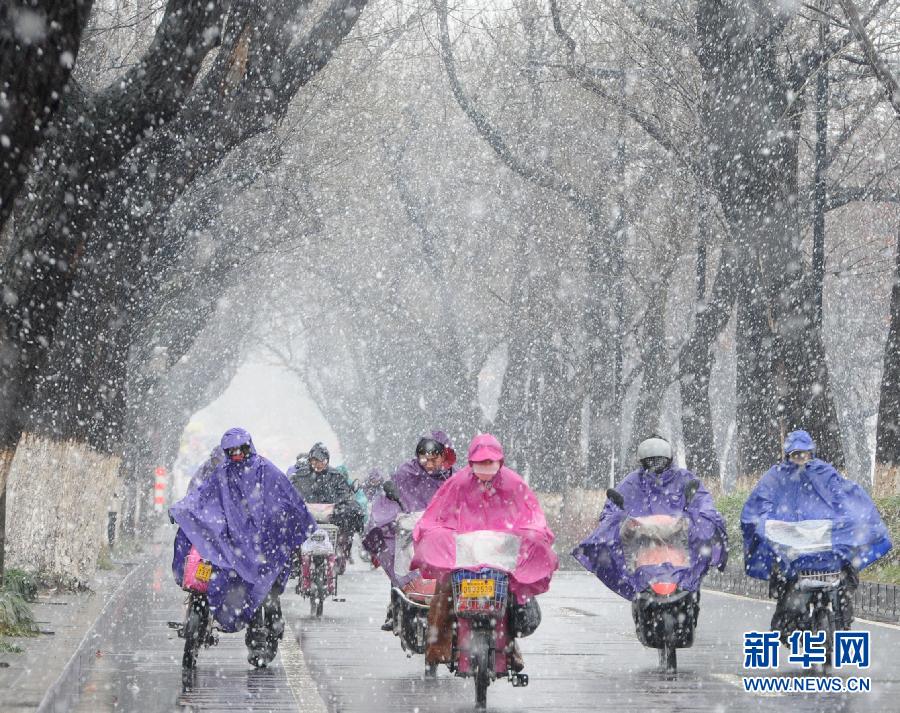 2月18日,人们在江苏苏州街头冒雪骑行。当日,我国南方多地迎来新一轮雨雪天气,江苏、浙江等多省发布暴雪预警。 新华社发(杭兴微 摄)