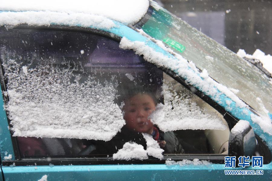 2月18日,在浙江省临安市街头,一名小朋友从落满积雪的车窗向外张望。当日,我国南方多地迎来新一轮雨雪天气,江苏、浙江等多省发布暴雪预警。 新华社发(胡剑欢 摄)