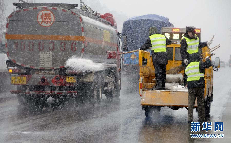 2月18日,江西昌九高速沙河收费所工作人员对路面进行融雪作业。当日,我国南方多地迎来新一轮雨雪天气,江苏、浙江等多省发布暴雪预警。 新华社发(杨风胜 摄)