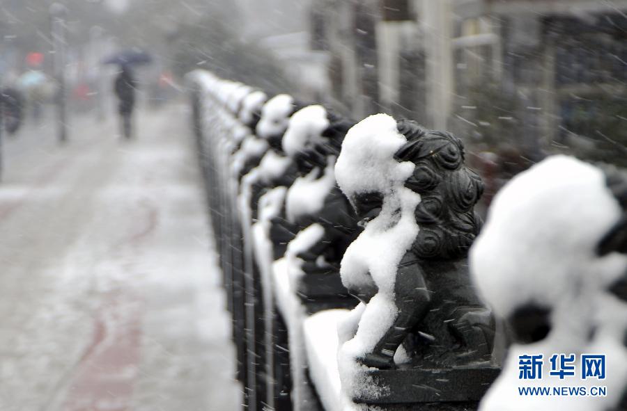 2月18日,江苏扬州飞鹤桥上的石狮子落满积雪。当日,我国南方多地迎来新一轮雨雪天气,江苏、浙江等多省发布暴雪预警。 新华社发(刘江瑞 摄)