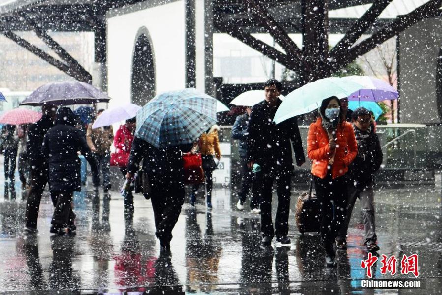 2月18日,苏州火车站北广场上的旅客在大雪纷飞中赶路。当日,江苏古城苏州迎来大雪。中新社发 王思哲 摄