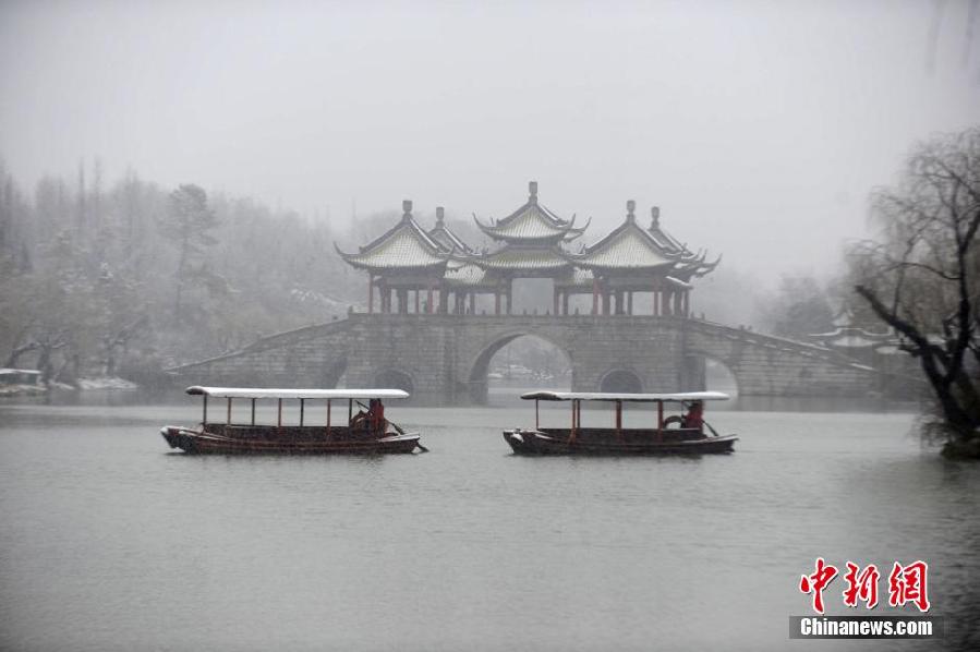 2月18日,江苏扬州大雪纷飞,颇具江南韵味的扬州古典园林瘦西湖景区银装素裹、如诗如画,呈现出一派“北国风光”,吸引了不少市民和游客走出户外,感受春雪带来的快乐。图为扬州瘦西湖的“五亭桥”银装素裹。孟德龙 摄