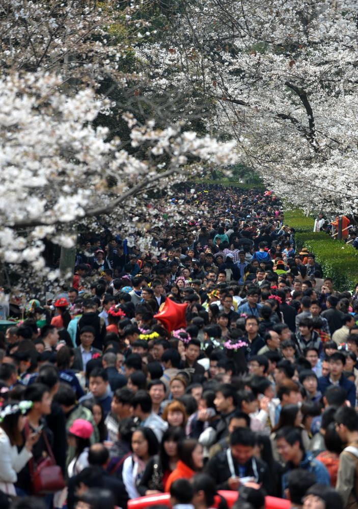 2014年03月22日,武汉大学樱花怒放,樱花大道上人潮涌动的火爆场景。