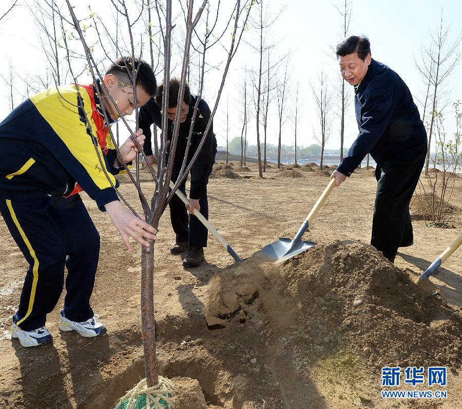 习近平一下车,就拿起铁锹径直走向植树地点同北京市、国家林业局的负责同志和少先队员开始植树。总书记来到一棵白皮松旁,挥锹铲土填入树坑中,随后培实新土、堆起围堰,道道工序做得认真细致。碧桃、元宝枫、榆叶梅、丁香、西府海棠……习近平接连种下6棵树苗,每种一棵,他都同少先队员一起提水浇灌,并勉励他们努力做到德智体美全面发展,在努力学习的同时,树立劳动观念、劳动意识、劳动习惯,热爱劳动,强健体魄,长大以后通过辛勤劳动为建设祖国贡献力量。