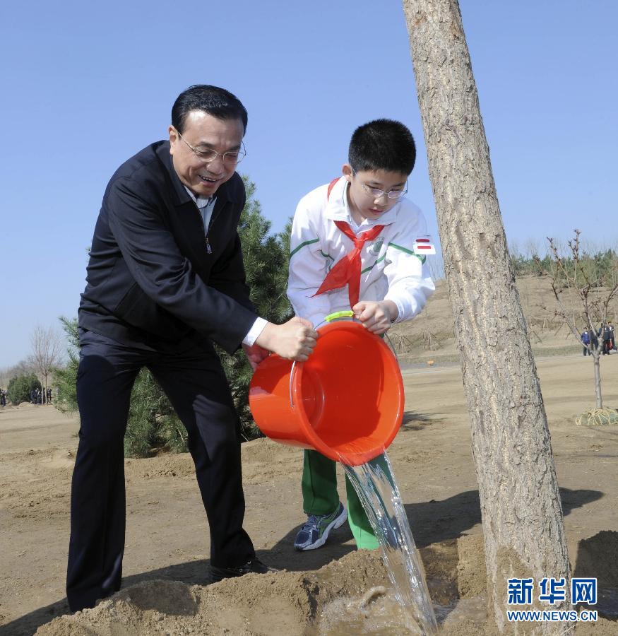 4月4日,党和国家领导人习近平、李克强、张德江、俞正声、刘云山、王岐山、张高丽等来到北京市海淀区南水北调团城湖调节池参加首都义务植树活动。这是李克强同少先队员一起给树浇水。新华社记者 张铎 摄
