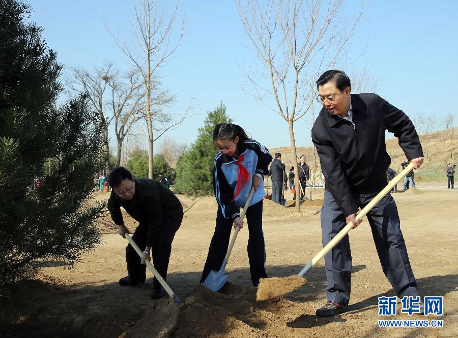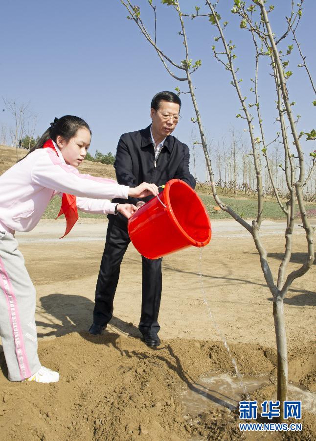 4月4日,党和国家领导人习近平、李克强、张德江、俞正声、刘云山、王岐山、张高丽等来到北京市海淀区南水北调团城湖调节池参加首都义务植树活动。这是张德江在植树。新华社记者 刘卫兵 摄