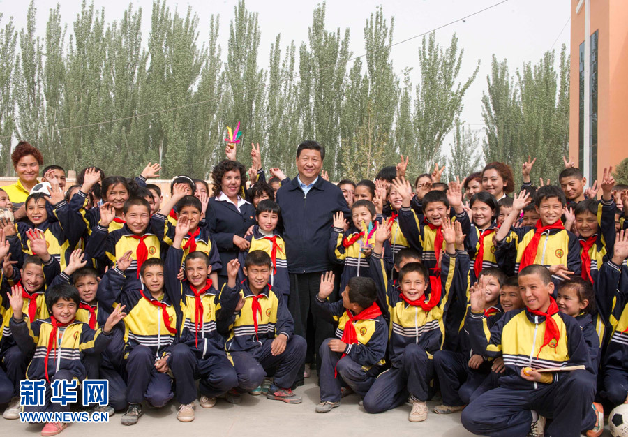 4月27日至30日,中共中央总书记、国家主席、中央军委主席习近平在新疆考察。这是4月28日上午,习近平在疏附县托克扎克镇中心小学同师生们合影。新华社记者 谢环驰 摄
