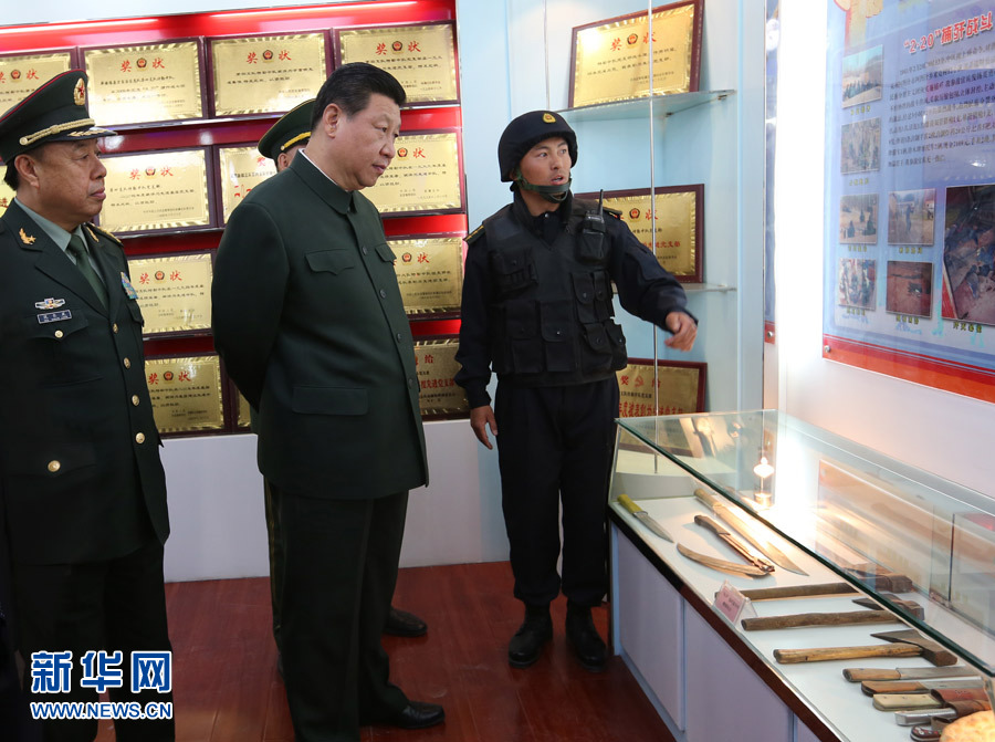 4月27日至30日,中共中央总书记、国家主席、中央军委主席习近平在新疆考察。这是4月27日下午,习近平在武警新疆总队某部特勤中队荣誉室听取中队打击暴力恐怖活动的战斗情况汇报。新华社记者 李刚 摄