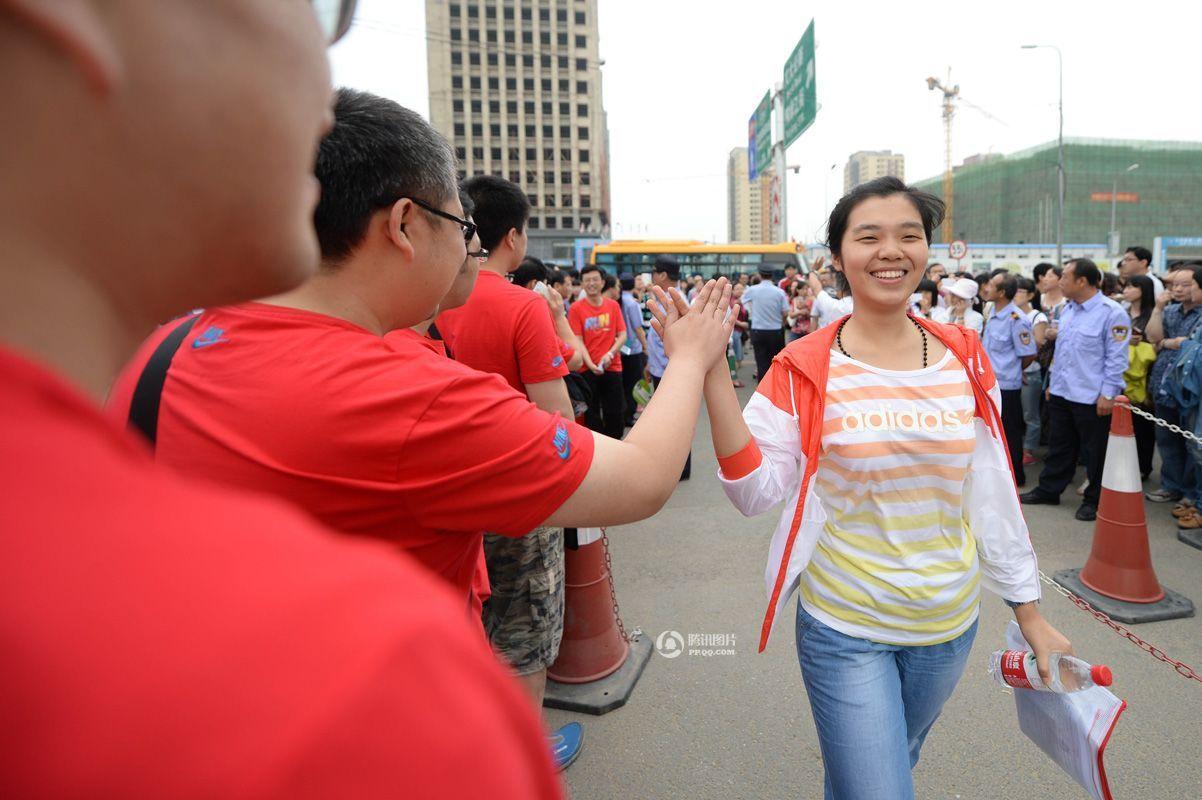 6月7日,一名考生在进入沈阳市第十一中学考点前与老师击掌,加油鼓劲。新华社记者 潘昱龙 摄