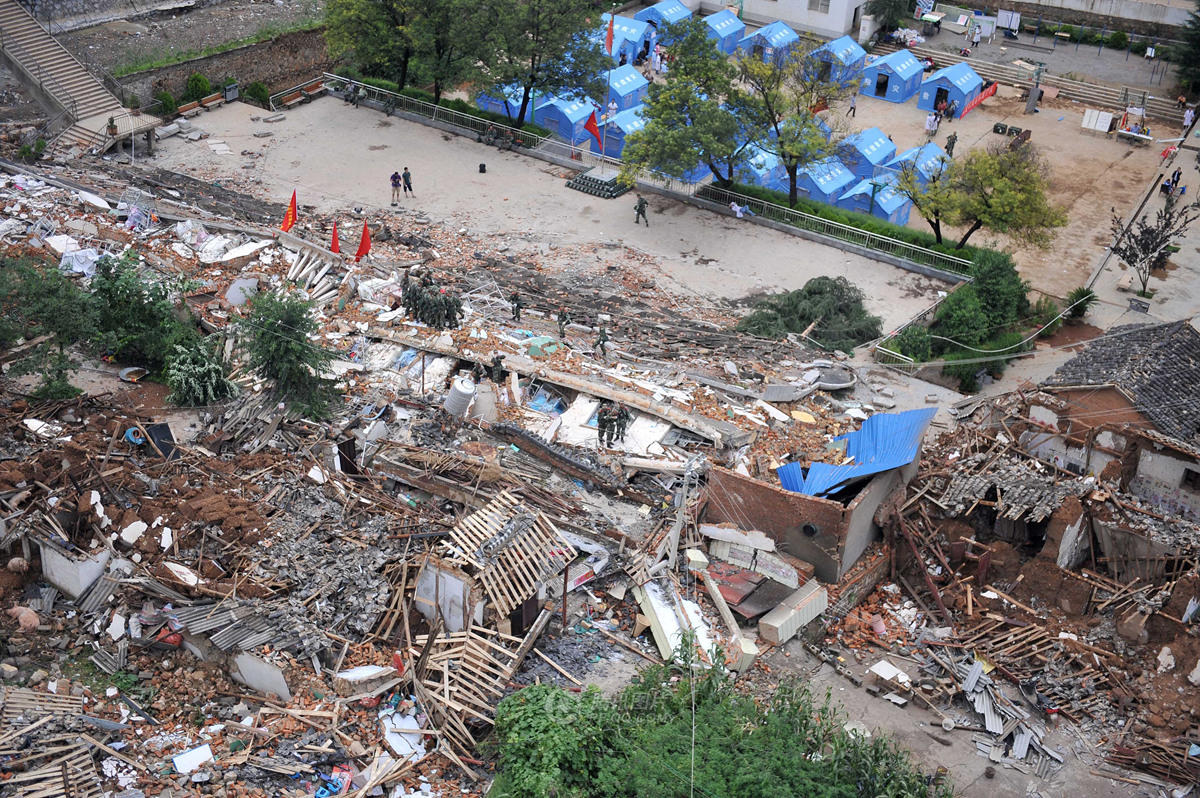 这是8月4日航拍的震中昭通鲁甸县龙头山镇。8月3日16时30分,云南省昭通市鲁甸县发生6.5级地震。地震发生后,公安部消防局立即启动地震灾害应急响应机制。截至8月4日11时,云南省公安消防总队已调集937名官兵、141辆消防车、17条搜救犬参加鲁甸地震救援,共从废墟中搜救出66人,其中30人生还,疏散转移群众1300余人。新华社记者 薛玉斌 摄