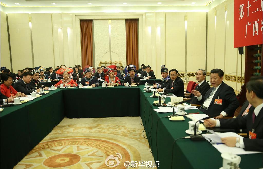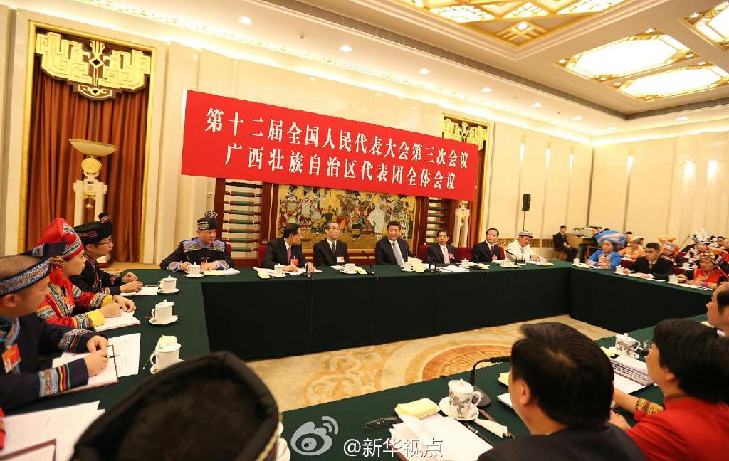 新华网北京3月8日电 据新华社“新华视点”微博报道,3月8日上午,习近平参加十二届全国人大三次会议广西代表团审议。
