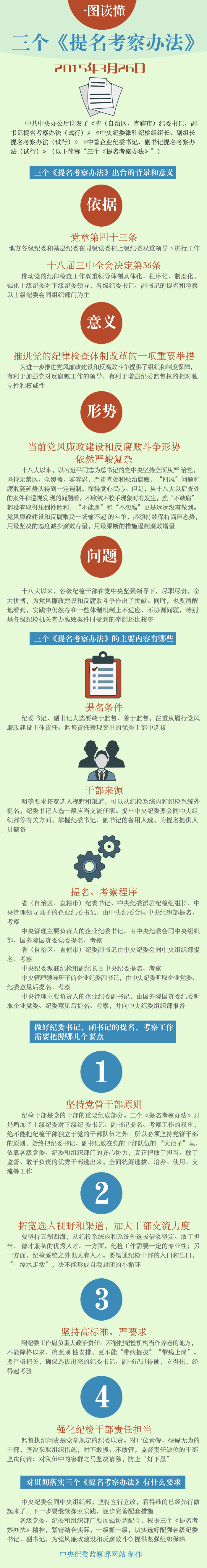 三个提名考察办法是党中央推进党的纪律检查体制改革的重大举措,是落实党章规定和十八届三中全会第36条的具体化,是中央纪委立足本届任期立行立改、探索实践的制度成果,为坚持党对反腐败工作的领导、增强纪委监督权的权威性提供了组织制度保障。办法紧扣提名考察作出规定,明确省(自治区、直辖市)纪委书记副书记、中央纪委派驻纪检组组长副组长、中管企业纪委书记副书记的提名、考察以上级纪委会同组织部门为主。在提名条件上,突出强调纪委书记、副书记人选要敢于监督、善于监督,注重从履行党风廉政建设主体责任、监督责任表现突出的优秀干部中选拔;在干部来源上,明确要拓宽选人视野和渠道,可以从纪检监察系统内和系统外提名,纪委书记人选一般应当交流任职。在提名、考察程序上,分别明确了提名、考察具体要求和有关各方的职责分工。