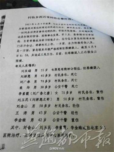 通报称,犯罪嫌疑人刘双瑞,男,55岁,长期患有精神分裂症。三名死者分别为:刘新愿,男,40多岁,村民务农;刘广春,男,70多岁,村民务农;袁帅,男,30多岁,公安干警。五名伤者分别为:李素霞(刘广春之妻),女,70多岁,村民务农,重伤;刘玉民(刘新愿之哥),男,50多岁,村民务农,重伤;刘金山,男,50多岁,村民务农,轻伤;王涛,男,43岁,公安干警,轻伤;李金维,男,42岁,公安干警,重伤。其中,刘金山、刘玉民、李素霞、李金维送往北京301医院治疗,王涛送往沧州市中心医院治疗。