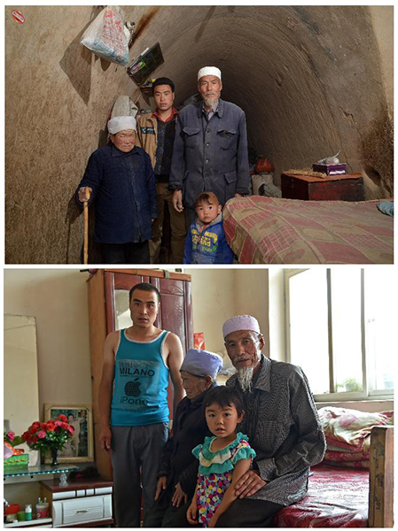 拼版照片:上图为在宁夏固原市彭阳县红白阳镇农民马成军(左二)一家人在自家的窑洞内合影(2013年6月15日摄);下图为在宁夏银川市兴庆区月牙湖乡,移民马成军(左一)一家人在自家的移民新居合影(2015年6月22日摄)。新华社记者 王鹏 摄