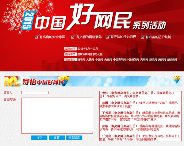 6月29日,中央网信办全体负责同志在“2015中国好网民”系列活动专题网页“寄语中国好网民”专区集体在线留言并为活动点赞。中宣部副部长、中央网信办主任、国家网信办主任鲁炜留言:“争做好网民,共筑中国梦。”中央网信办副主任徐麟留言“争当内外兼修‘四有’好网民,凝聚崇德向善社会正能量!”副主任王秀军留言:“用网络安全意识筑牢防线,用网络防护技能武装头脑,用守法行为习惯自我约束,用文明网络素养滋养网络,自觉培养‘中国好网民’意识!”副主任彭波留言:“倡导网络善语良言,共建网络绿水青山。传承网络文明风尚,构筑清朗网络空间!”副主任任贤良留言:“践行核心价值观,弘扬网上正能量,争做‘四有’好网民,实现网络强国梦。”