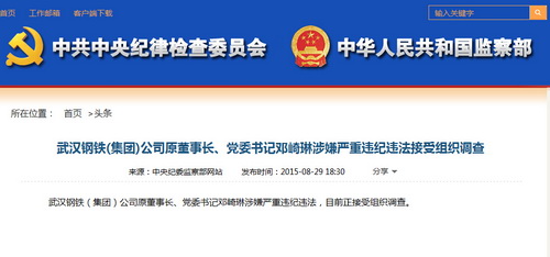 武汉钢铁(集团)公司原董事长、党委书记邓崎琳涉嫌严重违纪违法,目前正接受组织调查。