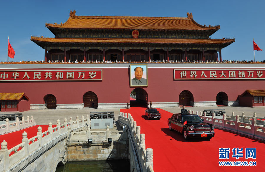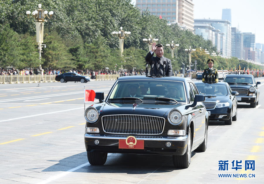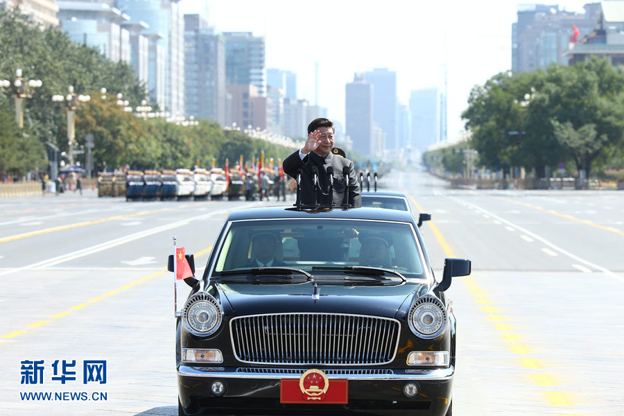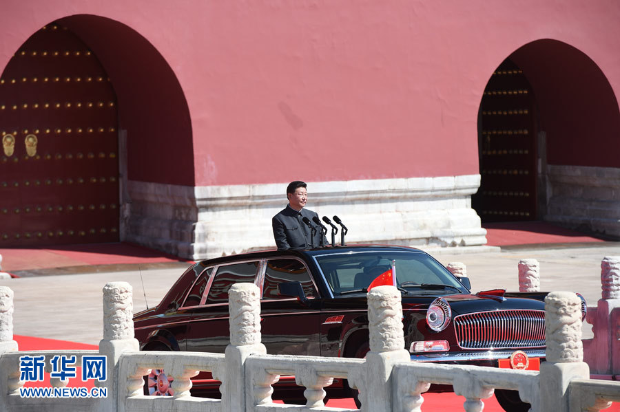 9月3日,纪念中国人民抗日战争暨世界反法西斯战争胜利70周年大会在北京天安门广场隆重举行。这是中共中央总书记、国家主席、中央军委主席习近平乘检阅车经过金水桥。新华社记者鞠鹏摄