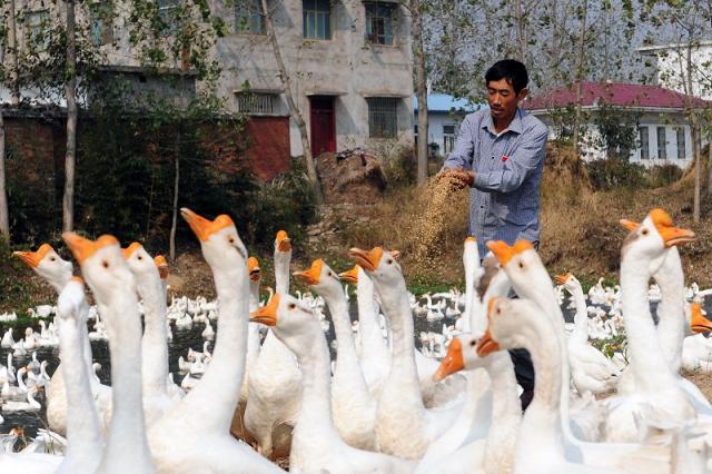 (在国家级贫困县河南省淮滨县,王店乡宋营村村民赵怀粮在给大白鹅喂饲料。冯大鹏2015年10月21日摄。赵怀粮利用“惠民扶贫贴息小额担保贷款”搞起了养殖业,在家门口就可以逐渐实现脱贫。)